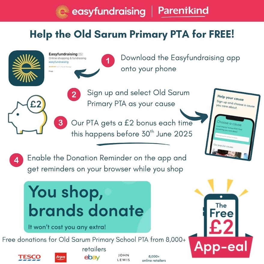 We have signed up as an EasyFundraising cause; this is a platform/app which donates a percentage of what you spend to a cause of your choice, without costing you anything extra. If you make a purchase through them, a commission is generated, and they turn that into a donation for our cause. Please do sign up to help support us in this way. It is quick and easy and does not cost you a thing, but generates much-needed funds for the school One of the PTA can refer you which gets us an extra £1 for each sign up so please ask one of us and find our more here below or here: https://www.easyfundraising.org.uk/causes/old-sarum-pta