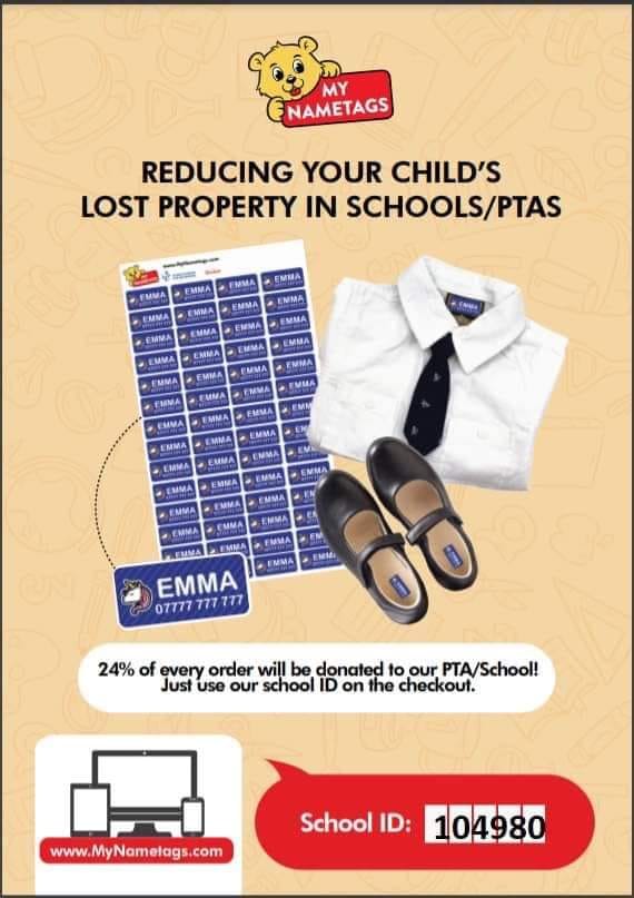 If you are looking to order name labels, please consider using MyNametags. The school's ID number is: 104980 and is detailed on the poster below and should be entered at checkout. It doesn’t cost you anything extra but the school will receive 24% of the cost of each order!