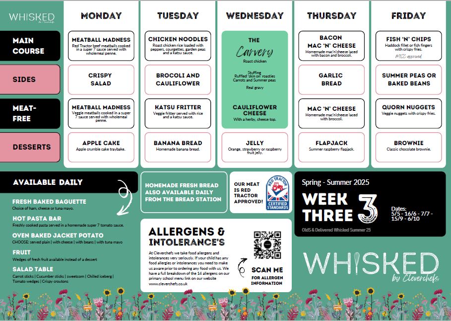 We offer hot school meals produced by our catering provider, Cleverchefs. There is a charge for each two course meal for children in years 3 – 6 and meals are free to all children in Reception, Year 1 and Year 2.